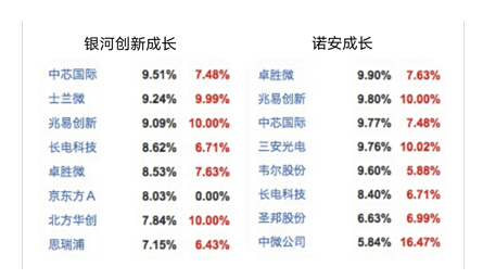 如此暴涨的背后是持仓的高度相似,根据今年一季报可见,诺安成长混合和银河创新成长两只基金的前十大重仓股高度相似,10只中有6只重合,分别为韦尔股份、中芯国际、卓胜微、兆易创新、北方华创、长电科技,对半导体的偏爱“有恃无恐”。
