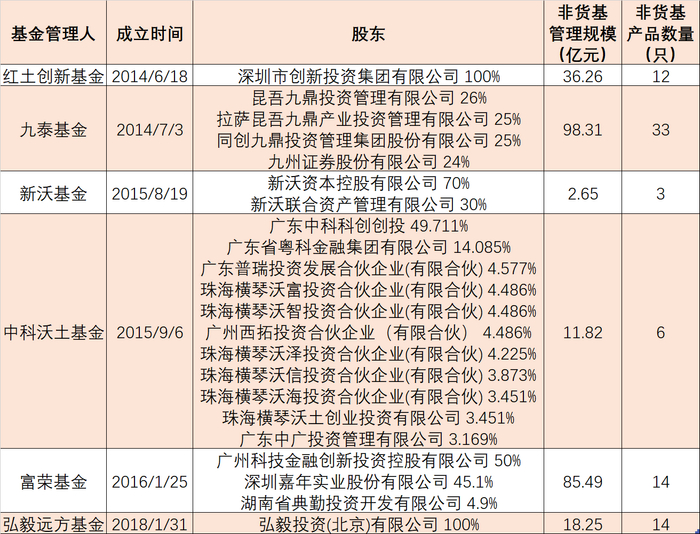 此外,在业界被认为是“PE系公募”的基金公司还有四家,分别是九鼎投资发起设立的九鼎基金,中科科创发起设立的发起设立中科沃土基金,广州科金投资发起设立的富荣基金,以及新沃资本发起的新沃基金等等。