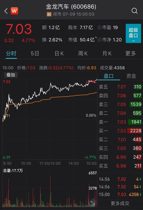 金龙汽车上涨4.77%。