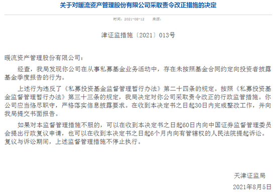 这份编号为津证监措施〔2021〕013号的监管函显示,暖流资产在从事私募基金业务活动中,存在未按照基金合同约定向投资者披露基金季度报告的行为。