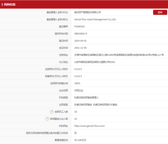 据中基协披露,暖流资产成立于2011年12月,登记于2014年4月,注册地位于天津滨海新区,办公地址则是行家喜闻乐见的北京市朝阳区。公司现有持证人员10名,管理规模在50-100亿元之间。