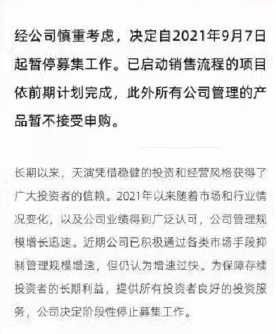 9月7日下午,一条消息传播量化投资圈:年内规模增长最犀利的机构之一天演资本宣布:“自2021年9月7日起暂停募集工作”。