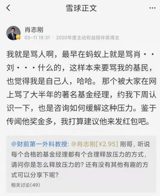也有网友问过他基金经理究竟是如何释放压力的。肖志刚给出了个机智的方案,我与基民一个战线!“我就是骂人啊,这样本来要骂我的基民,也觉得我是自己人。那个被大家在网上骂了大半年的著名基金经理,约我下周认识一下,也是咨询如何缓解这种压力。鉴于传闻他奖金多,我打算建议他来发红包吧。”