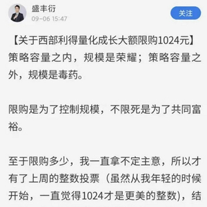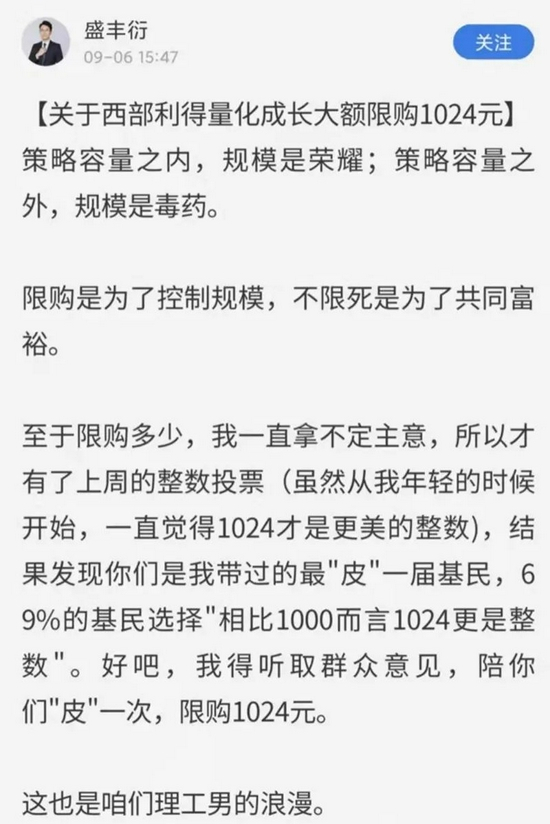 基金经理盛丰衍很快发文解释:“限购是为了控制规模,不限死是为了共同富裕。至于限购多少,我一直拿不定主意,所以才有了上周的整数投票(虽然从我年轻的时候开始,一直觉得1024才是更美的整数),结果发现你们是我带过的最‘皮’一届基民,69%的基民选择‘相比1000而言1024更是整数’。好吧,我得听取群众意见,陪你们‘皮’一次,限购1024元。”