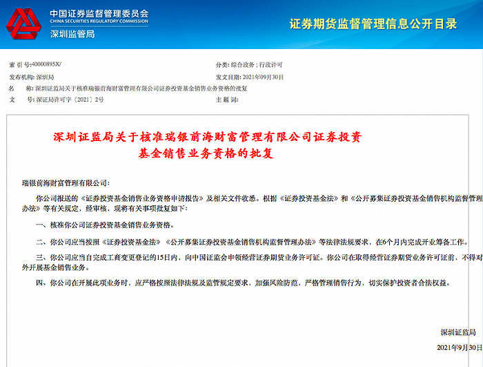 10月11日,瑞银集团全资子公司瑞银前海财富管理有限公司(下称瑞银前海)宣布已获深圳证监局批准,取得证券投资基金销售业务资格,成为继青岛意才之后第二家取得销售牌照的外资独资机构。
