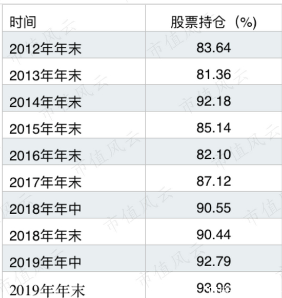 2017年开始,他的股票仓位都在85%以上,甚至很多时段超过90%。