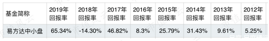 过往7年多,易方达中小盘基金只有2018年亏钱了,亏14.3%,比别人少亏很多。(如下表)