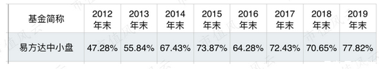 2019年末,易方达中小盘持股集中度77.82%,远远超过朱少醒管理的富国天惠基金40.81%,也远远高于傅鹏博管理的睿远成长价值基金47.05%。