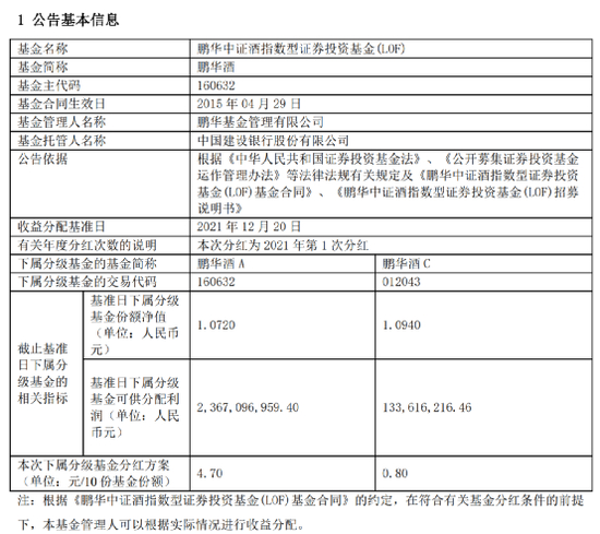 公告还显示,鹏华酒A份额和C份额,在基准日12月20日的净值分别为1.0720元、1.0940元,可供分配利润分别为23.67亿元和1.34亿元。另外,分红的权益登记日是2021年12月29日,现金红利发放日是2022年1月4日(场内)、2021年12月31日(场外)。