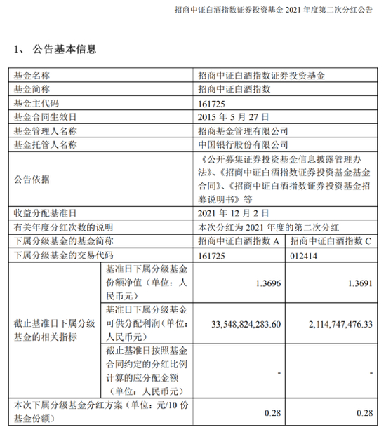 12月28日,鹏华中证酒指数证券投资基金(LOF)也发布2021年第一次分红公告。此次分红方案是,以12月20日为收益分配基准日,每10份A类基金份额分红4.7元,每10份C类基金份额分红0.8元。