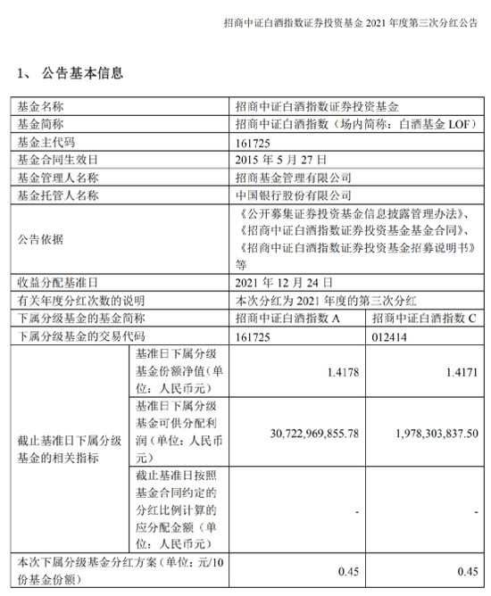 12月29日,招商中证白酒指数证券投资基金(场内简称:白酒基金LOF)发布2021年第三次分红公告。这次的分红方案是,每10份A类和C类基金份额均分配0.45元。按基准日2021年12月24日算,白酒基金LOF 此次A份额和C份额的可供分配利润分别为307.23亿元、19.78亿元。