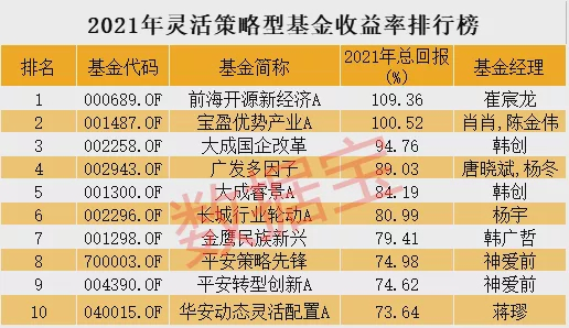 紧随其后的是大成国企改革、广发多因子、大成睿景A等基金,2021年回报率均超过80%。值得一提的是大成国企改革和大成睿景A的基金经理均为韩创。