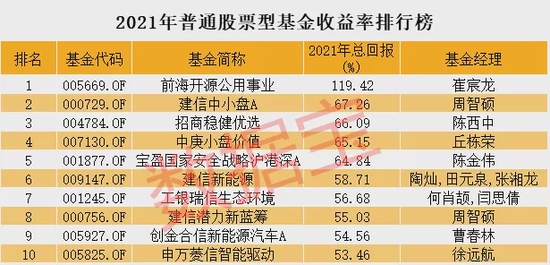 相比往年,普通股票型基金年度业绩冠军,或许早已经落定,由崔宸龙掌舵的前海开源公用事业以119.42%收益率夺得2021年业绩冠军,比第二名的建信中小盘A,足足多了60多个百分点。整体来看,2021年股票型基金中有140只未取得正收益,占比达到三分之一。