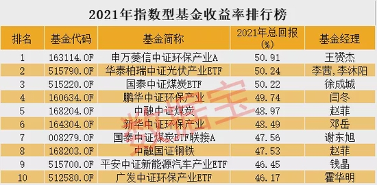 从年终业绩排行榜来看,27只指数型基金2021年净值涨逾40%。环保指数基金业绩最强,申万菱信中证环保产业A录得50%以上收益。除了环保,新能源类和煤炭指数基金表现也不错,华泰柏瑞中证光伏产业ETF和国泰中证煤炭ETF等回报率均超50%。相比较而言,主动型指数基金表现更优,平均收益率达到8.66%。