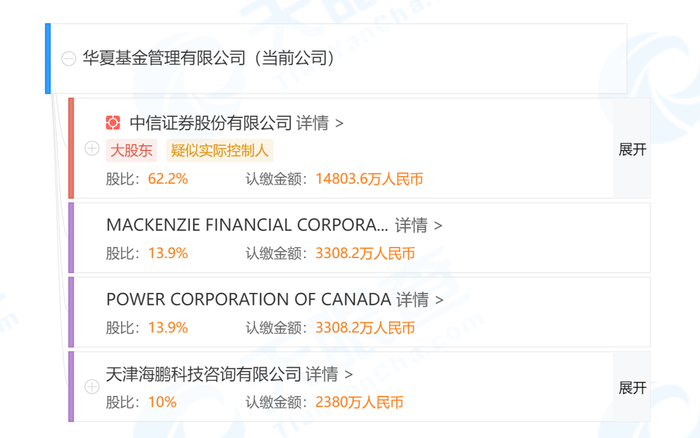 天眼查数据显示,若此项收购获证监会批准,华夏基金的股权结构将变为中信证券持股62.2%、麦肯齐持股27.8%、天津海鹏科技持股10%。
