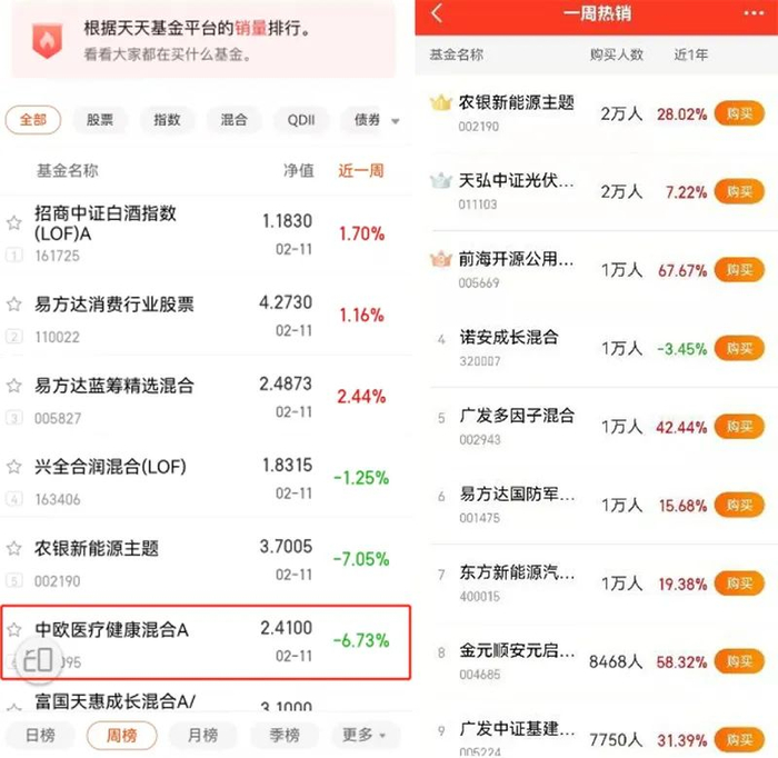 以天天基金2月14日的榜单为例,若从该平台APP首页的“排行”按钮点击进入,并查看热销榜的周榜,中欧医疗健康排名位于第六位;若下拉首页找到特色榜单栏目,并查询其中的“一周热销”(近一周购买人数最多的基金榜单),中欧医疗健康则没有出现在前15名以内。