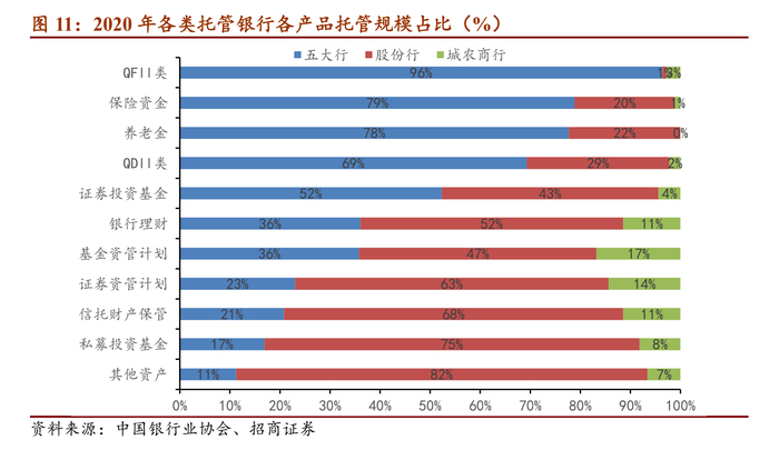 不过,从当前行业格局来看,城商行、农商行仍处于劣势地位。截至2020年末,国有大行和股份行在托管领域的市场份额超过90%,城商行、农商行占比不足8%,具体到证券投资基金领域,城/农商行仅占4%。戴志锋认为,地方中小银行可以有效补足基金公司主渠道单一销售的困境,但考虑到服务区域客户以及流动性管理的需求,如何在渠道竞争激烈的稳健型产品代销与托管领域增强客户粘性仍是难题。