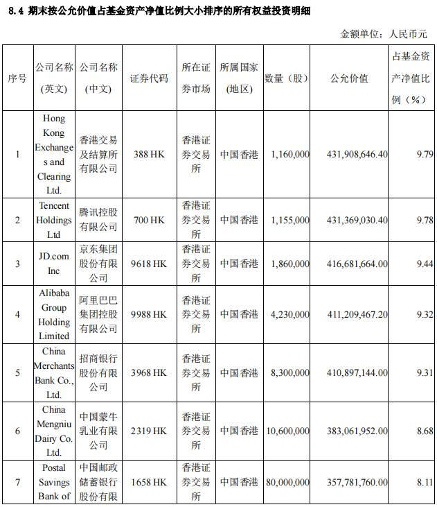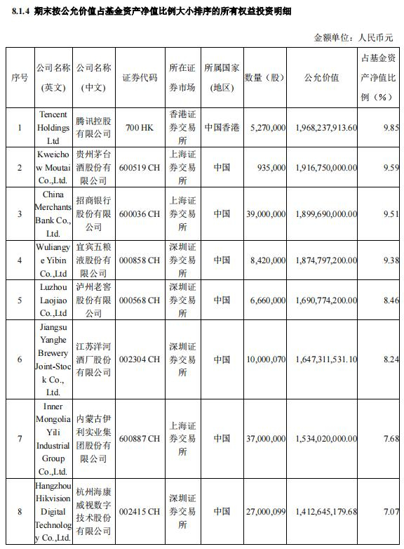 具体到个股,易方达蓝筹精选期末前十大重仓股并没有新面孔,仍然是腾讯控股(00700.HK)、海康威视(002415.SZ)、泸州老窖(000568.SZ)、贵州茅台(600519.SH)、招商银行(600036.SH,03968.HK)、五粮液(000858.SZ)、洋河股份(002304.SZ)、香港交易所(00388.HK)、伊利股份(600887.SH)、平安银行(000001.SZ)。