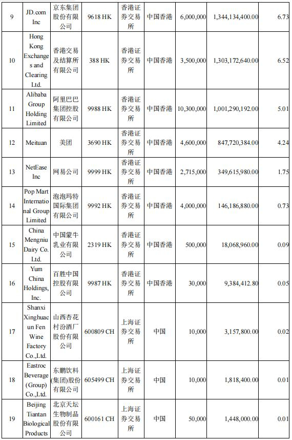 两只国际(QDII)股票型基金方面,易方达优质精选排名第11至第20名的个股包括:阿里(09988.HK)、美团、网易(09999.HK)、泡泡玛特、蒙牛乳业、百胜中国(09987.HK)、山西汾酒(600809.SH)、东鹏饮料(605499.SH)、天坛生物(600161.SH)、三棵树(603737.SH)。