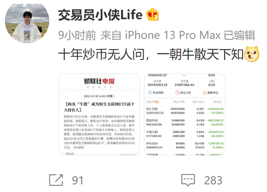 陈泽鑫与财经大V“交易员小侠Life”同名。3月30日下午,“交易员小侠Life”晒出恒生互联ETF的持仓。