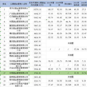 在已经披露的15家头部公募中,仅中银基金一家净利润不增反降。2021年底,中银基金净利润为10.25亿元,相比2020年的10.54亿元,同比减少2.66%。这和中银基金裹足不前的规模有关。基金业协会数据显示,中银基金2021年第一季度的非货币理财月均规模为2873.68亿元,截至去年四季度,该数据为2768.82亿元,不增反降。