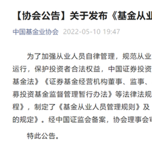 5月10日晚,中国证券投资基金业协会发布了《基金从业人员管理规则》及《关于实施<基金从业人员管理规则>有关事项的规定》,自发布之日起实施。