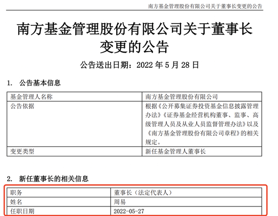 南方基金5月28日发布了董事长变更公告,周易担任南方基金董事长。南方基金称,周易现任华泰证券股份有限公司董事、首席执行官、执行委员会主任,2022年5月27日起兼任南方基金管理股份有限公司董事长。