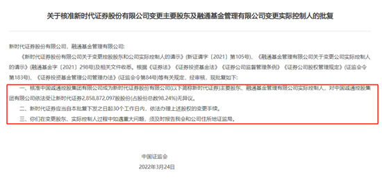 当时证监会批复宣布,核准中国诚通控股集团有限公司成为新时代证券股份有限公司(以下简称新时代证券)主要股东、融通基金管理有限公司实际控制人,对中国诚通控股集团有限公司依法受让新时代证券2,858,872,097股股份(占股份总数98.24%)无异议。