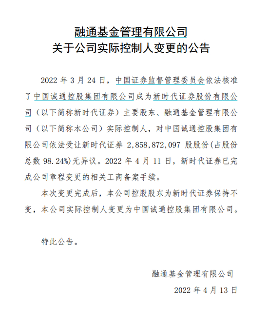 在4月份,融通基金也宣布公司实际控制人变更,并表示在2022年4月11日,新时代证券已完成公司章程变更的相关工商备案手续。而此次变更完成后,融通基金控股股东为新时代证券保持不变,实际控制人变更为中国诚通控股集团有限公司。