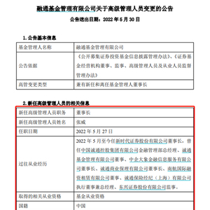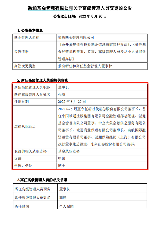 5月30日,融通基金发布高级管理人员变更的公告,高峰因个人原因离任董事长,新任张威为公司董事长,任职日期2022年5月27日。