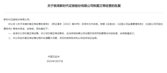 5月27日,证监会宣布新时代证券结束被托管状态,恢复正常经营。