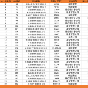 中国机构前5强中含3家保险资管,1家银行理财子公司,1家公募基金。中国前30强含6家保险资管,1家保险公司旗下养老金管理公司,14家公募基金,1家券商,8家理财子公司。