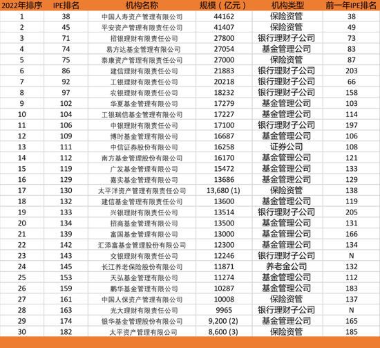 在 2022 年 IPE 500 榜单中,中国 30 强管理人的位置介于第 38 和第 182 之间。