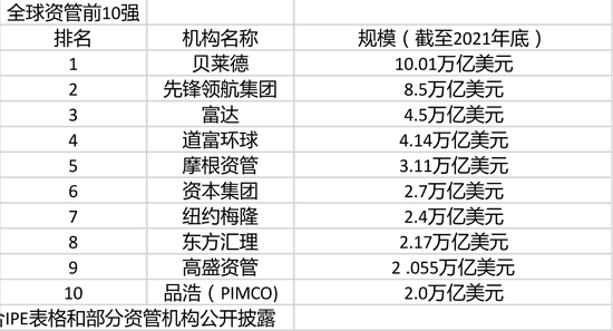 截至2021年底,进入全球资管10强的机构分别为贝莱德、先锋领航、富达、道富环球、摩根资管、资本集团、纽约梅隆、东方汇理、高盛、品浩(PIMCO)。与前1年的名单相比,前10内部的位次有所调整,前4名与头一年维持不变。摩根资管前进一步跃升至第5名,资本集团则退后1名,从前1年的第6跌落至第5。品浩从前一年的第7名跌至第10名,纽约梅隆、东方汇理、高盛较前1年分别前进1名。