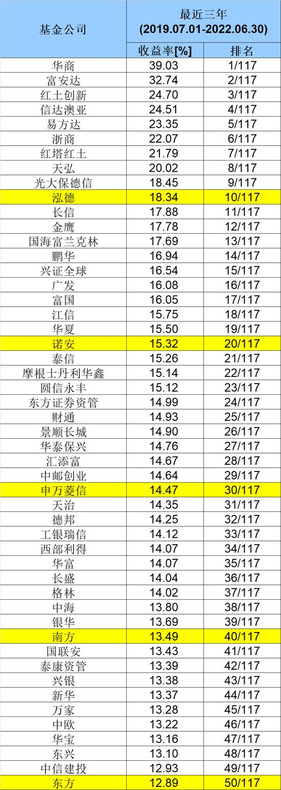 此外,富安达、红土创新分别以32.74%和24.70%的收益率,位列三年期第二名和第三名。其余表现较佳的公司还有信达澳亚、易方达、浙商、红塔红土等。