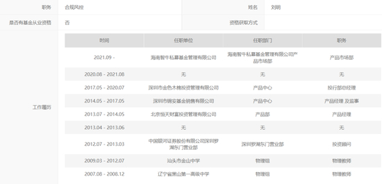 据中基协备案信息,当事人刘明并没有基金从业资格。此前他曾在北京恒天财富投资管理有限公司(简称:恒天财富)任职;其后加入锦安控股旗下的深圳市锦安基金销售有限公司(简称:锦安基金)。2017年6月起,刘明出任金色木棉合规风控负责人。2021年9月,他登记入职海南智牛私募基金管理有限公司(简称:海南智牛),但并未出现在高管和从业人员名单中。
