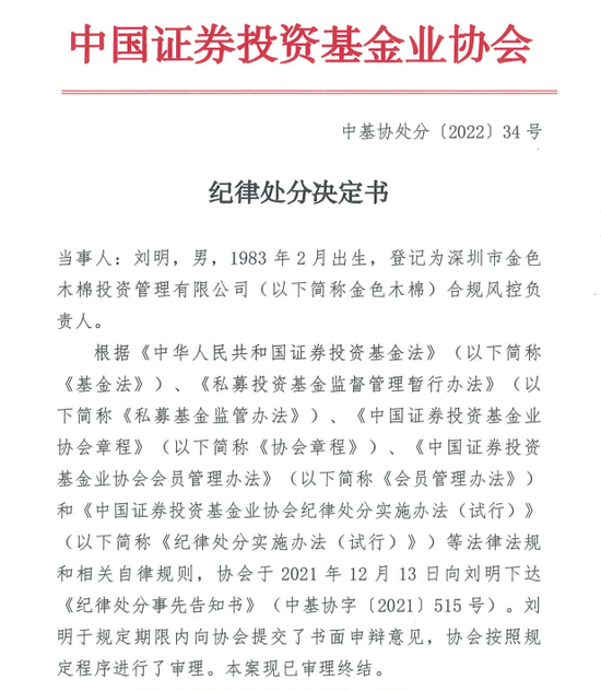 据这份纪律处分决定书披露,当事人刘明,生于1983年,登记为深圳市金色木棉投资管理有限公司(简称:金色木棉)合规风控负责人。