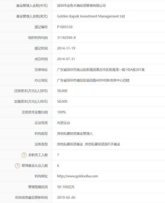 据中基协备案信息,金色木棉成立于2014年7月,同年11月在中基协登记备案。管理规模在50亿至100亿区间。