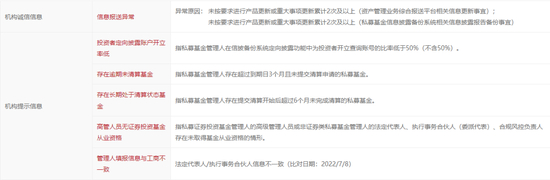 这也难怪,中基协以红字提示了一项诚信信息——信息报送异常。资产管理业务综合报送平台和私募基金信息披露备份系统相关信息披露报告备份,累计两次以上未按要求进行产品更新或重大事项更新。