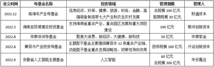 启信宝数据显示,华安嘉业的历史对外投资事件一共有19次,其中注销的有5家,存续的包括合肥数字产业投资基金、安徽安华创新风险投资基金有限公司等。其实从对外投资的情况来看,华安嘉业的布局都在安徽省内,也有数据显示其招引项目在安徽落地规模近200亿元。正是由于长期深耕,华安嘉业成为安徽省人工智能主题母基金管理人也在情理之中。