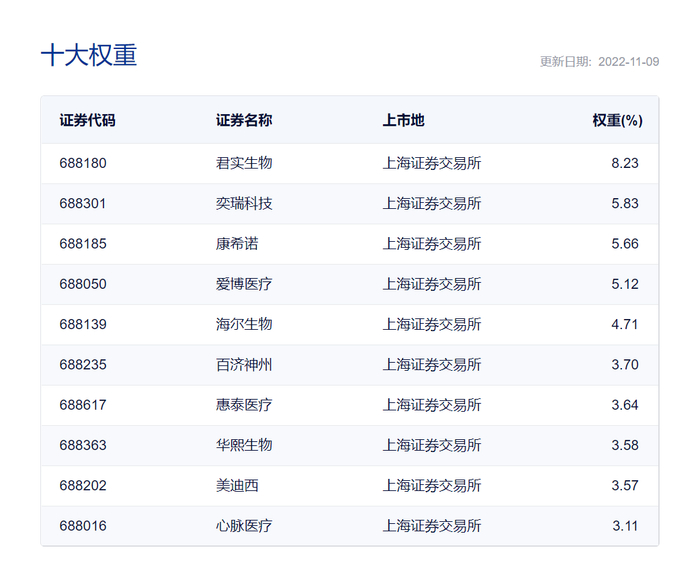 从成份股来看,该指数的前十大权重股分别为君实生物、弈瑞科技、康希诺、爱博医疗、海尔生物、百济神州、惠康医疗、华熙生物、美迪希、心脉医疗,前十大权重股合计占比47.14%。成份股整体“硬科技”属性突出,创新药企业涵盖癌症、肿瘤、免疫系统疾病、传染性疾病等多个治疗领域,体外诊断、疫苗企业积极奋战在抗疫一线,既有东方生物等年营收超百亿的龙头企业,也有康希诺等采用科创板第五套标准上市的创新药企业,展现出科创板制度包容性土壤的赋能成效。