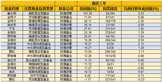 以2022年10月末为限,将时间节点拉长至3年,剔除任职三年期以内的员工,财通基金无一名基金经理近三年业绩翻倍,相比较下财通资管的投资老将姜永明则达到翻倍水准,不过,按管理风格继续划分,以体现基金经理投资能力的任职年化回报上看,近三年财通基金的金梓才则表现最佳,灵活配置类基金以6.88%远超其他产品回报,且其管理的股票类基金也以2.56%排名第二,高于姜永明的年化收益表现。