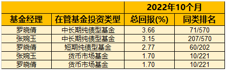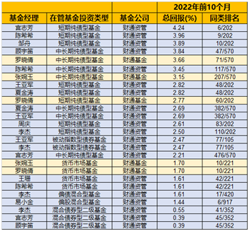 对比标的方面,以同属财通证券旗下、由财通证券全资控股的财通资管(2014年12月成立,截至2022年三季度末在管资金规模1559.43亿元,基金经理23人,基金数量106只)为参考,财通基金与财通资管同为兄弟公司,具体业务和产品结构也高度相近,存在明显竞争关系。2022年前10个月,财通资管有21位基金经理在其擅长领域实现了正向收益,富志芳的短期债基产品以4.24%回报位列同类排名第6、陈希希、邹舟的短债基金紧随其后,3.96%、3.89%收益率分列同行业第9、10。罗晓倩作为财通基金的回报冠军,其中长债仅收益处于两家企业回报第5、且低于财通资管顾宇笛的同类产品。