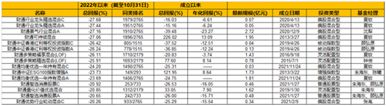 2022年,财通基金主动权益产品整体回报不佳,截至10月31日共有15款产品年内亏损超过20%,当中夏钦管理的财通行业龙头精选混合C、A以超过27个百分点亏损位列公司前两名,另外其管理的财通可持续混合、财通多策略福享混合(LOF)等同样回撤严重。相对应的是,2021年公司收益冠军,财通价值动量混合前十个月亏损仅为11.54%,同类排名788/2179,张胤操盘的财通福盛混合发起(LOF)A,前十个月表现则更好一些,亏损不足8个百分点,同类排名102/2765。