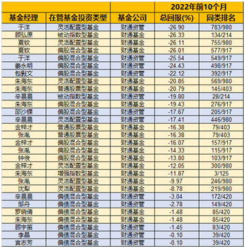 在债券回报全面落后于财通资管的同时,财通基金的回撤控制的表现也不如财通资管。截至2022年10月末,两家公司合计有29人次的基金经理未能在其管理的基金类型中实现盈利,财通基金在该项统计中上榜17次,且在亏损比大于10个百分点的基金经理名单中,更是占据了多数份额。