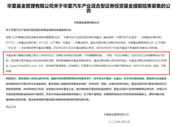 同样在2月8日,华夏基金宣布,根据有关规定,华夏基金决定提前结束华夏汽车产业混合基金的募集,2023年2月13日为基金最后认购日,自2023年2月14日起本基金不再接受投资者的认购申请。