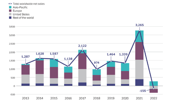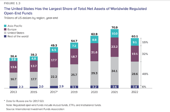 不过,2022年基金销售地区之间有很大的区别。例如,2022年美国和欧洲的长期限基金在过去十多年来首次出现净流出(分别为1910亿美元和2250亿美元),但亚太地区和其他地区的长期监管基金仍然保持净流入,亚太地区,中国和日本是吸金领头羊。