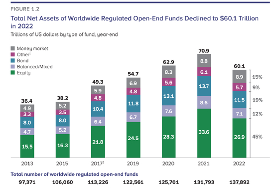 拉长时间来看,全球受监管的开放式共同基金总规模在2019年底达到54.7万亿美元,2020年底增至62.9万亿美元,2021年底增至70.9万亿美元,到了2022年底,数字转头往下降至60.1万亿美元。作为参照,2022年全球第一大经济体美国的GDP约25.5万亿美元,第二大经济体中国的GDP约18.1万亿美元。