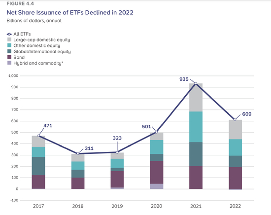 尽管较2021年的创纪录的9350亿美元的净发行量有所下降,但2022年美国ETF的净发行量也达到6090亿美元。