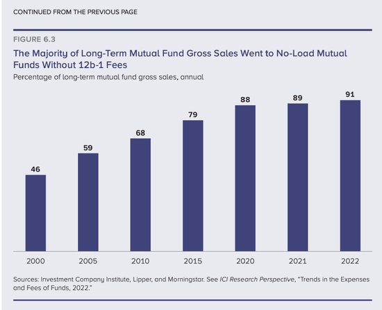 2022年,长期限共同基金(刨去货币基金的共同基金)91%的毛销售额由免销售费免12b-1费基金创造。2000年,这一数值为46%。